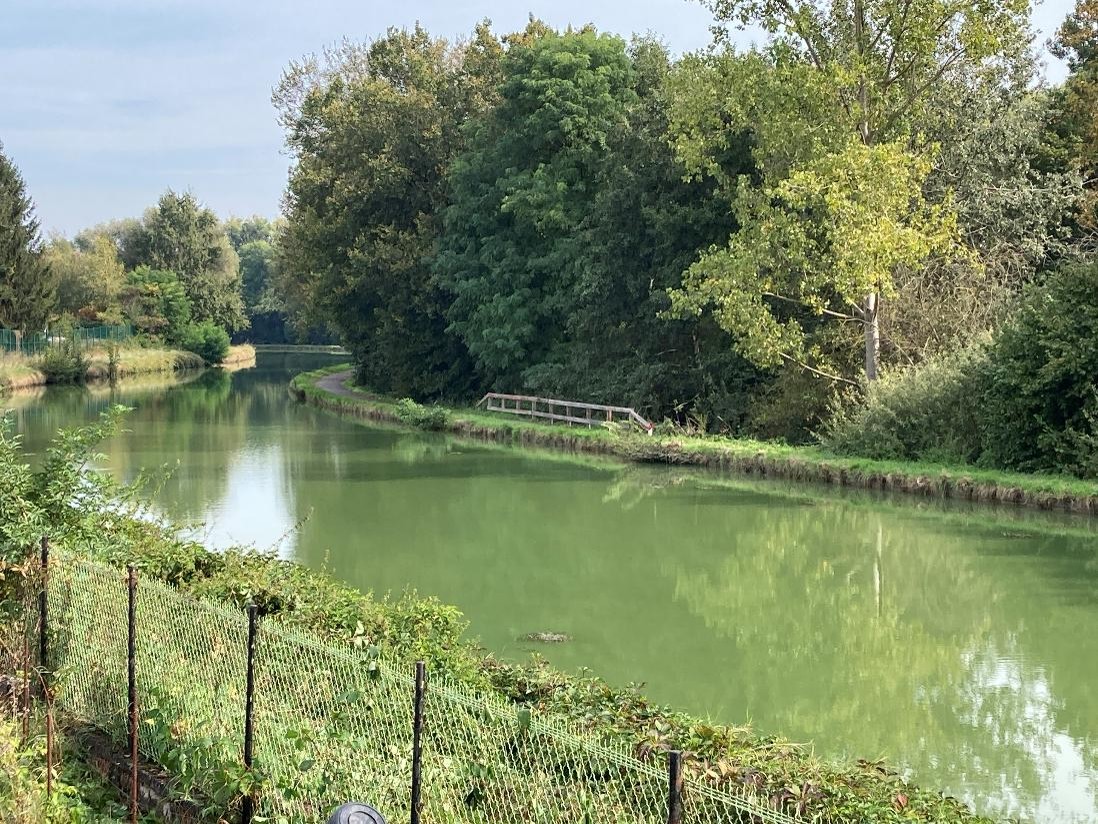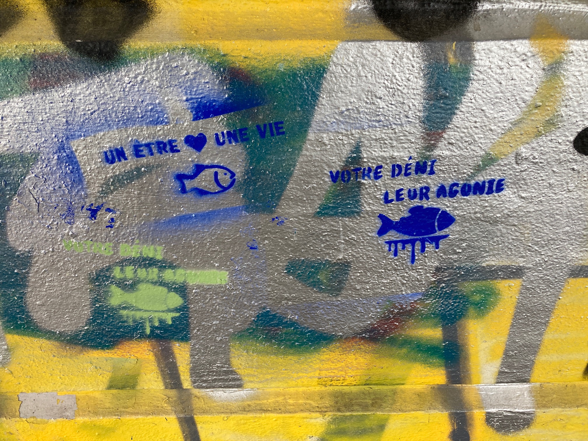 Graffiti along the Canal Marne-au-Rhine in Hoenheim in 2024, where anglers sometimes fish. The graffiti says “Your denial, their agony” and “A life, a being.”