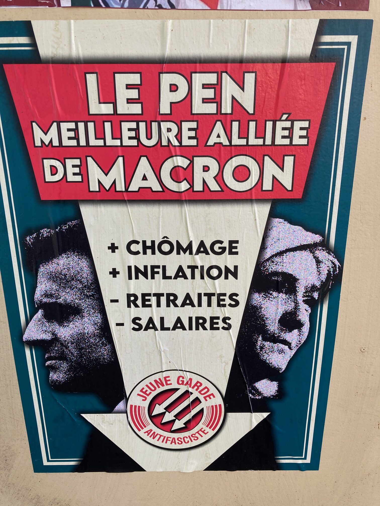 Political poster of the “Antifasciste Jeune Garde” (Anti-fascist Young Guard) who associate centrist Emmanuel Macron with the far-right Marine Le Pen, claiming that the centrist-right position will result in more unemployment (chomage) and inflation, and hurt retirement (retraites) and salaries.