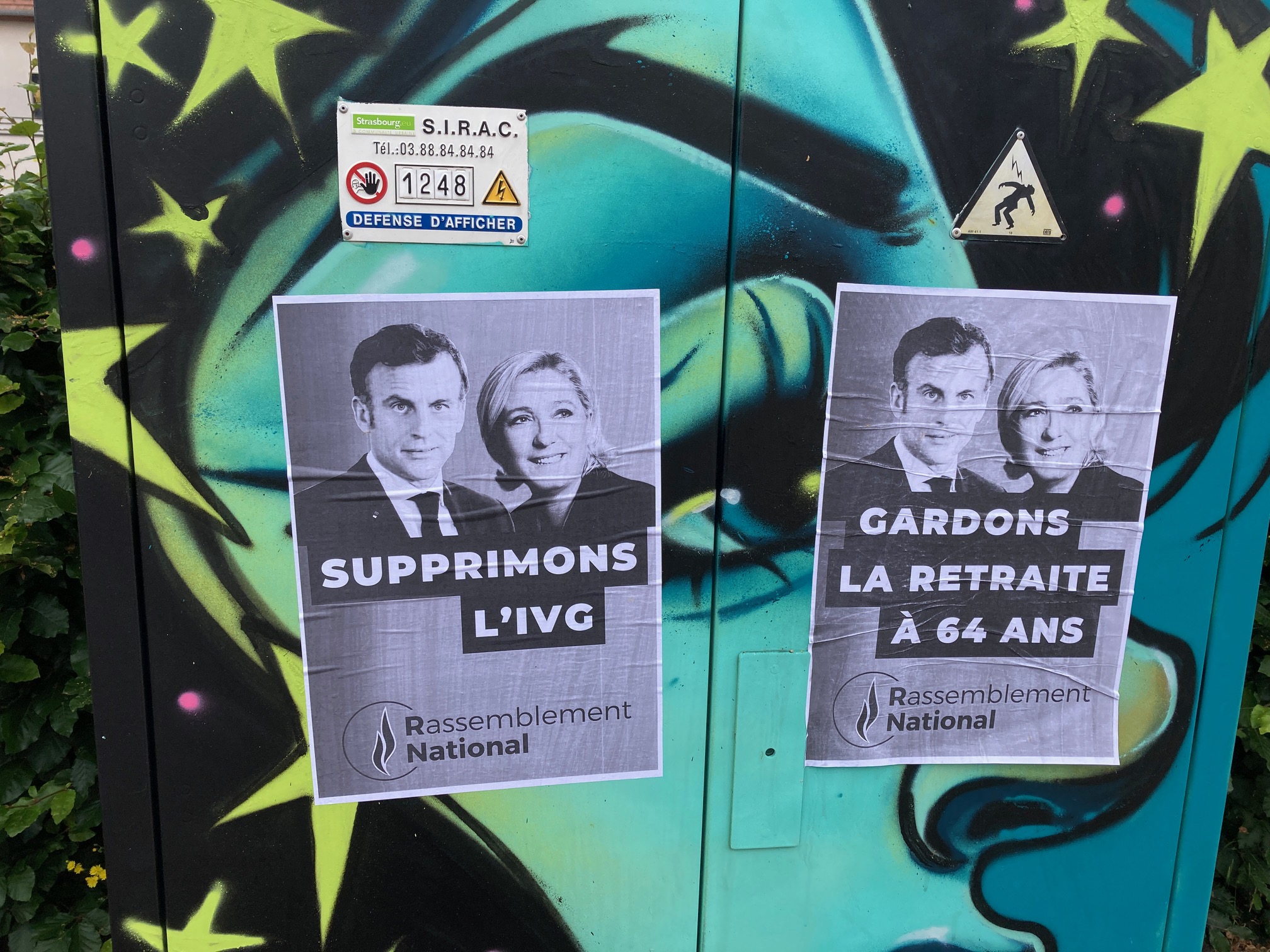 Right-wing political posters in Hoenheim, north of Strasbourg, 2024. Emmanuel Macron is centrist, Marine Le Pen is far right, but both appear on this poster of the far-right Rassemblement National (formerly Front Nationale) campaigning to keep the retirement age at 64 years rather than reducing it to 60 years, as the liberals demanded. Notice the plaque prohibiting posters (defense d’aficher).