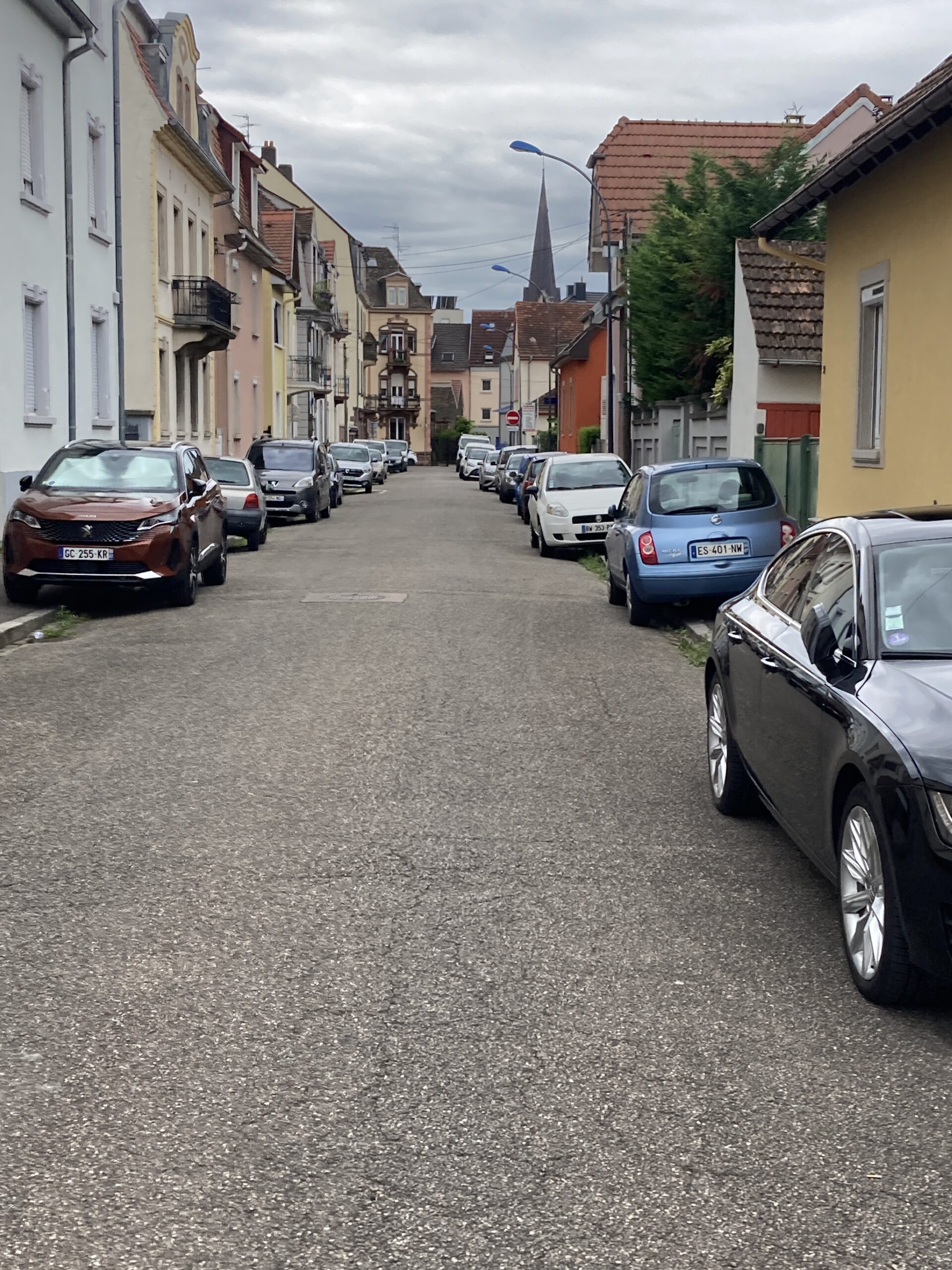 If you don’t like my driving, then stay off the sidewalk! Schiltigheim, north of Strasbourg. Sidewalk parking is legal on these narrow streets.