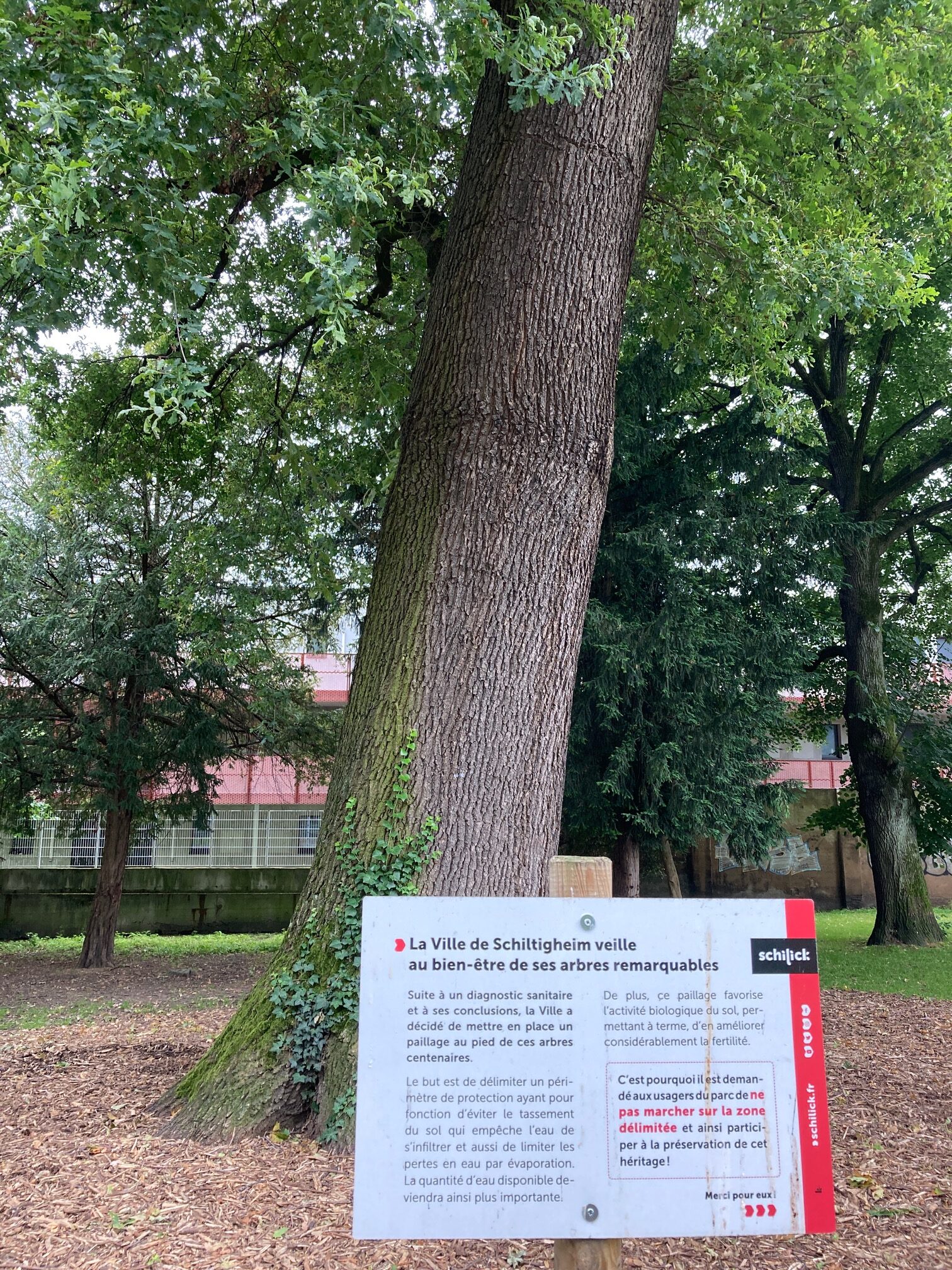 A park in Schiltigheim, north of Strasbourg, has a sign telling people to not walk in the rooting zone of a large pedunculate oak (Quercus robur).
