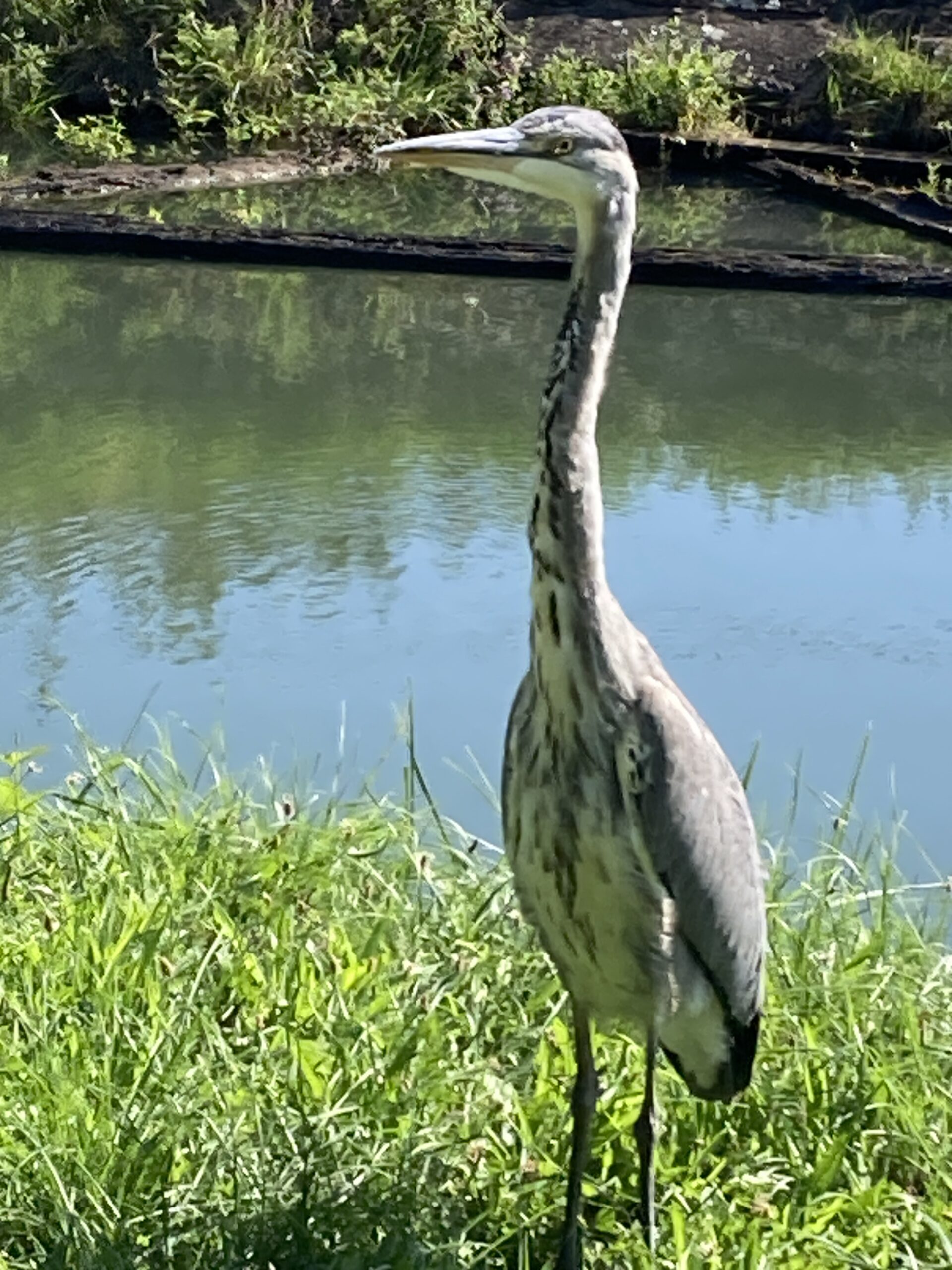 This gray heron (Ardea cinerea) is, unlike the others, unafraid of humans as he stands next to the Marne-au-Rhin canal in Bischheim, north of Strasbourg, France.