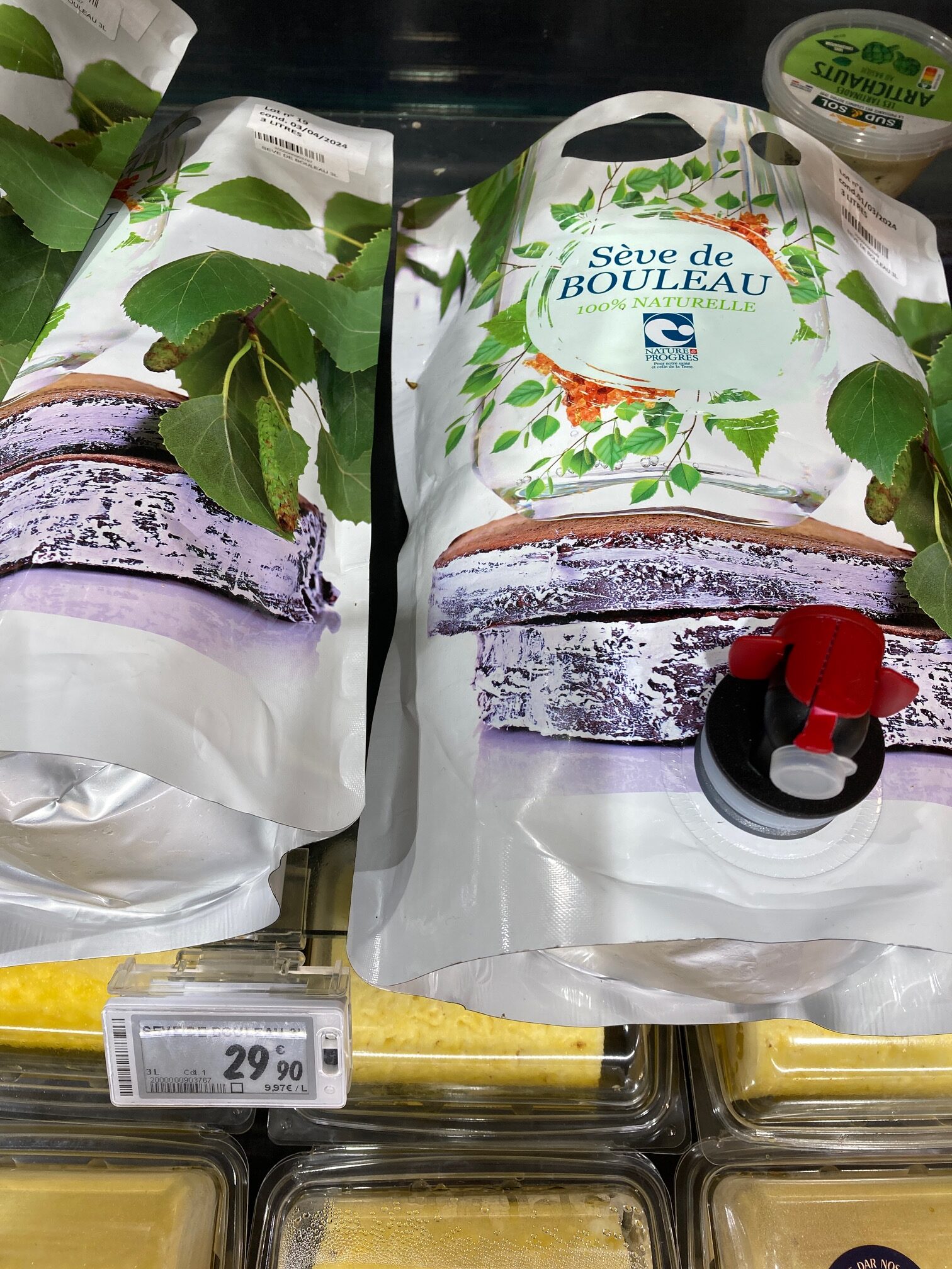 You too can drink birch sap (seve de bouleau) for only 10 euros a liter (30 euros a package). It is just water that has been filtered by the endodermis of birch roots. Supermarket in Hoenheim, north of Strasbourg.
