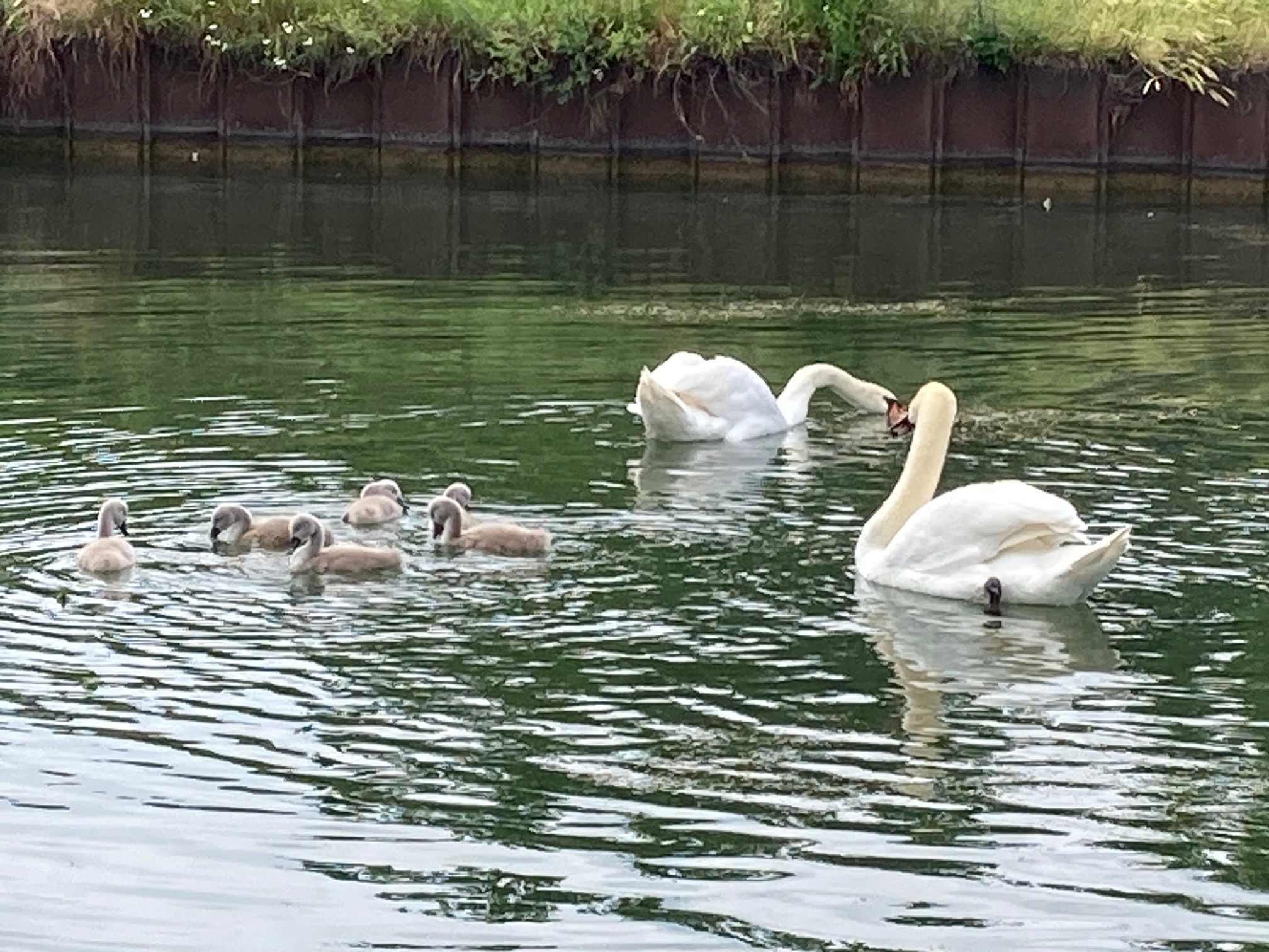 Bridge over the Marne-au-Rhin canal, Hoenheim, north of Strasbourg, with resident swans. The municipality maintains decorative flowers each summer.