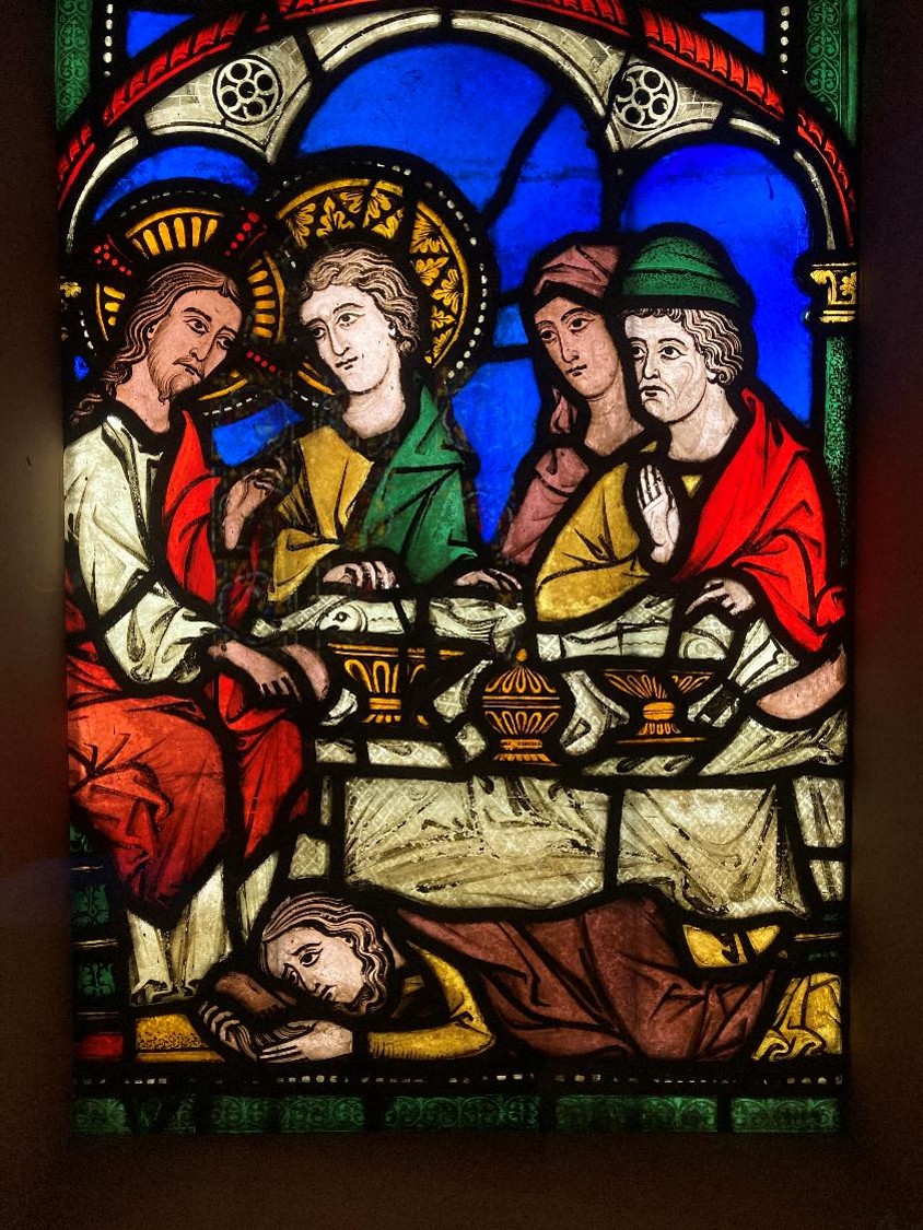 From the Museum of the construction of the Cathedral in Strasbourg, which contains many artifacts no longer in the cathedral. Stained glass window showing the sinful woman kissing Jesus’ feet at a banquet.