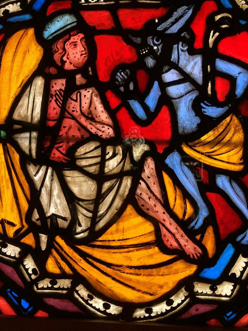 From the Museum of the construction of the Cathedral in Strasbourg, which contains many artifacts no longer in the cathedral. Stained glass window showing a smallpox victim.