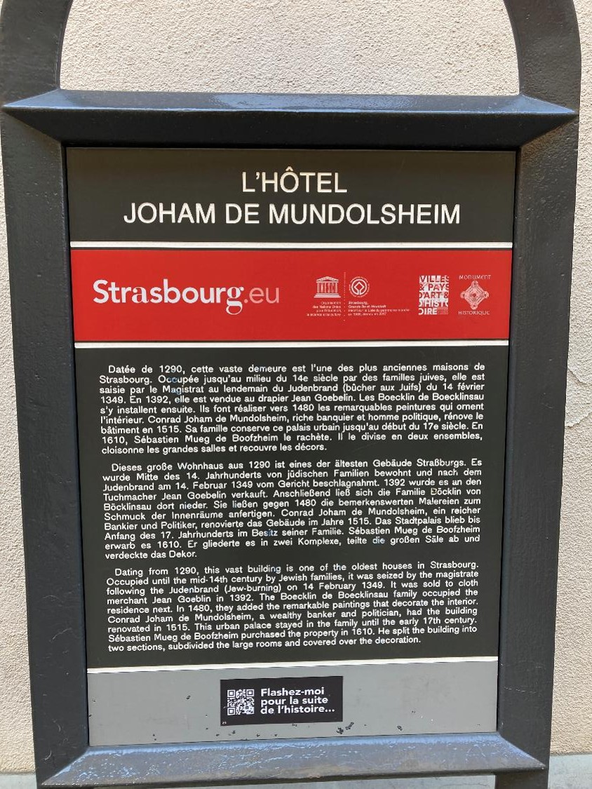 Commemorative plaque of Hotel Joham de Mundolsheim, one of the oldest houses in Strasbourg. Jewish families lived in this house until the Jew-burning of Valentine’s Day 1349, an event commemorated in the name of a nearby street, Rue Brulee.