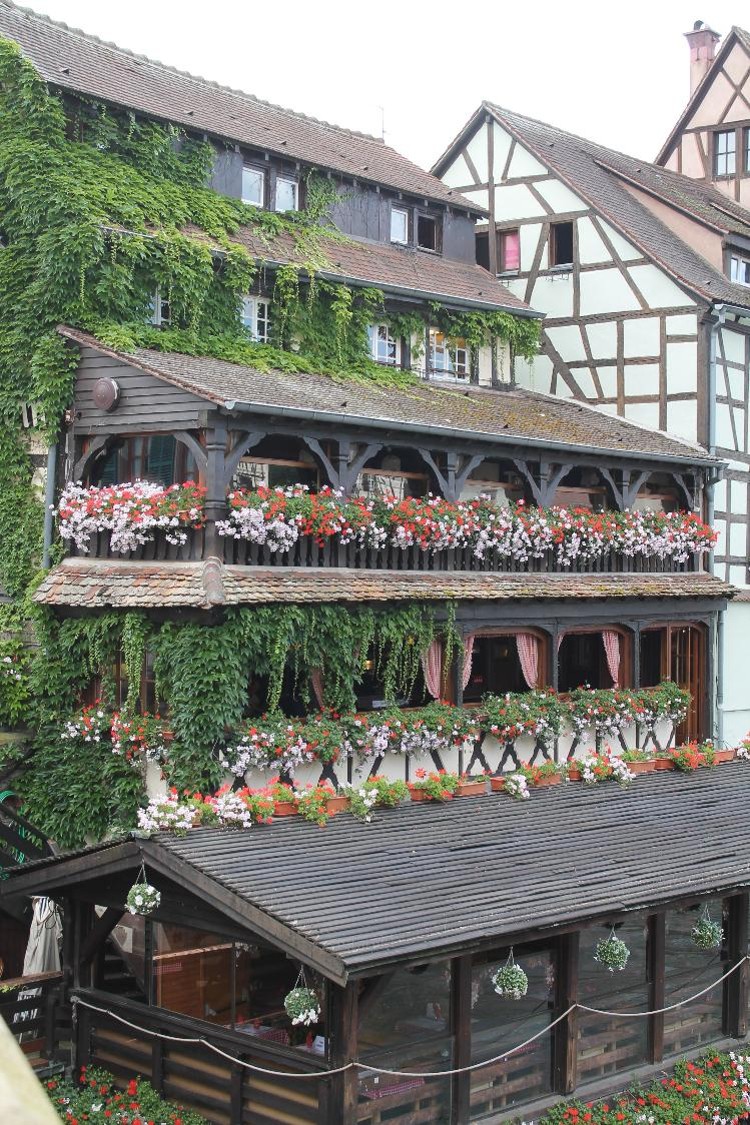 An old renovated building in Strasbourg, showing the colombage (wood beam) architecture.