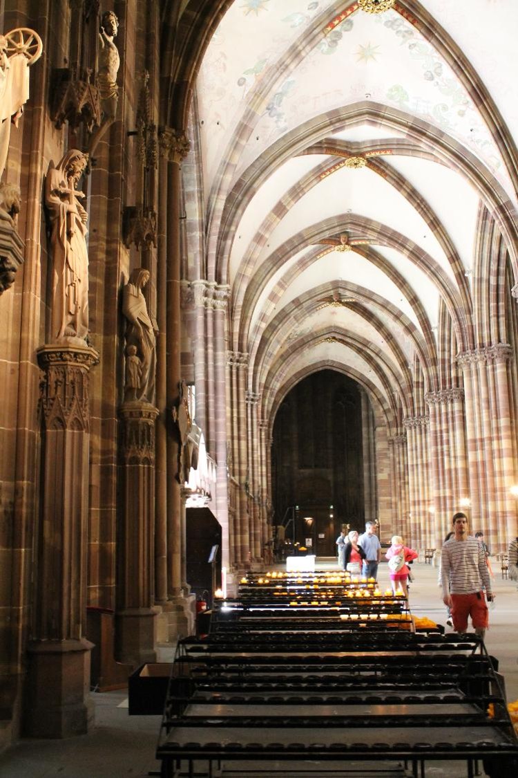 Votive candles and vaulted ceiling inside the Cathedral at Strasbourg.