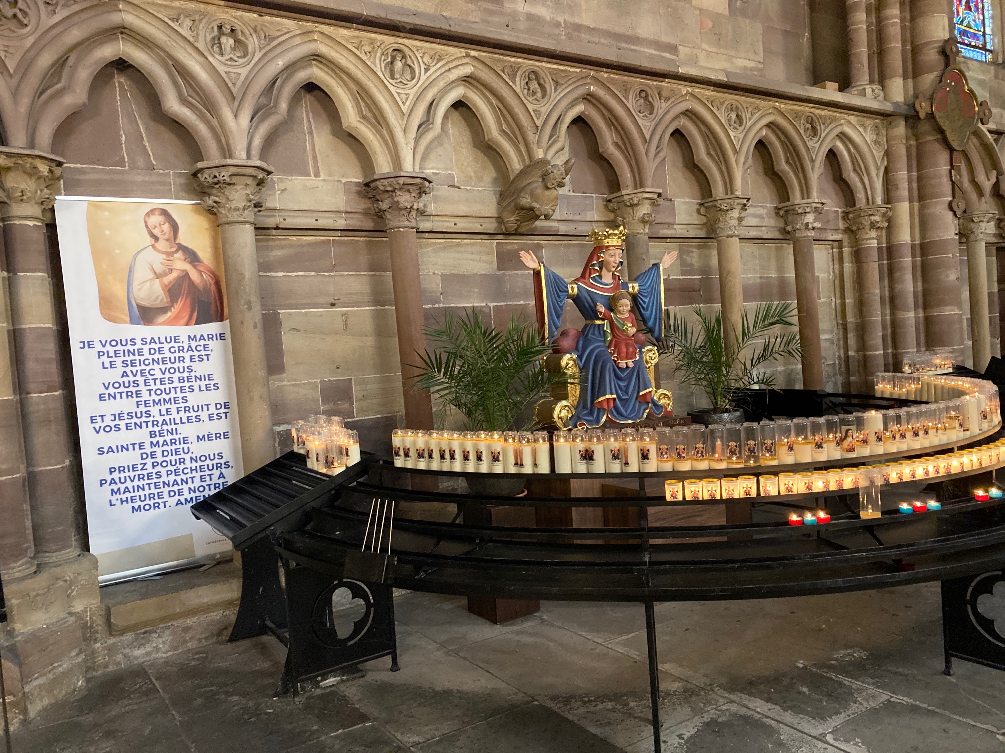 Votive candles in the Cathedral at Strasbourg. The candles do the praying for the people: “St. Mary, mother of God, pray for us poor sinners, now and at the hour of our death.”