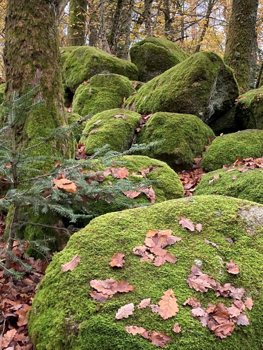 Mosses cover the boulders in the forests of the Vosges Mountains in Alsace, France, because of the frequent mist and fog.