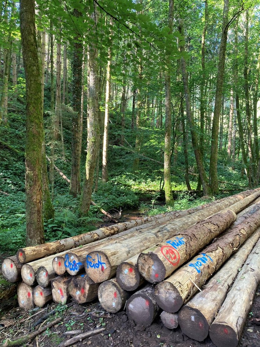 Conifer logs selectively cut from a forest near Lutzelhouse, Vosges Mountains, Alsace, France. Though it is a forest reserve, careful forestry is practiced here.
