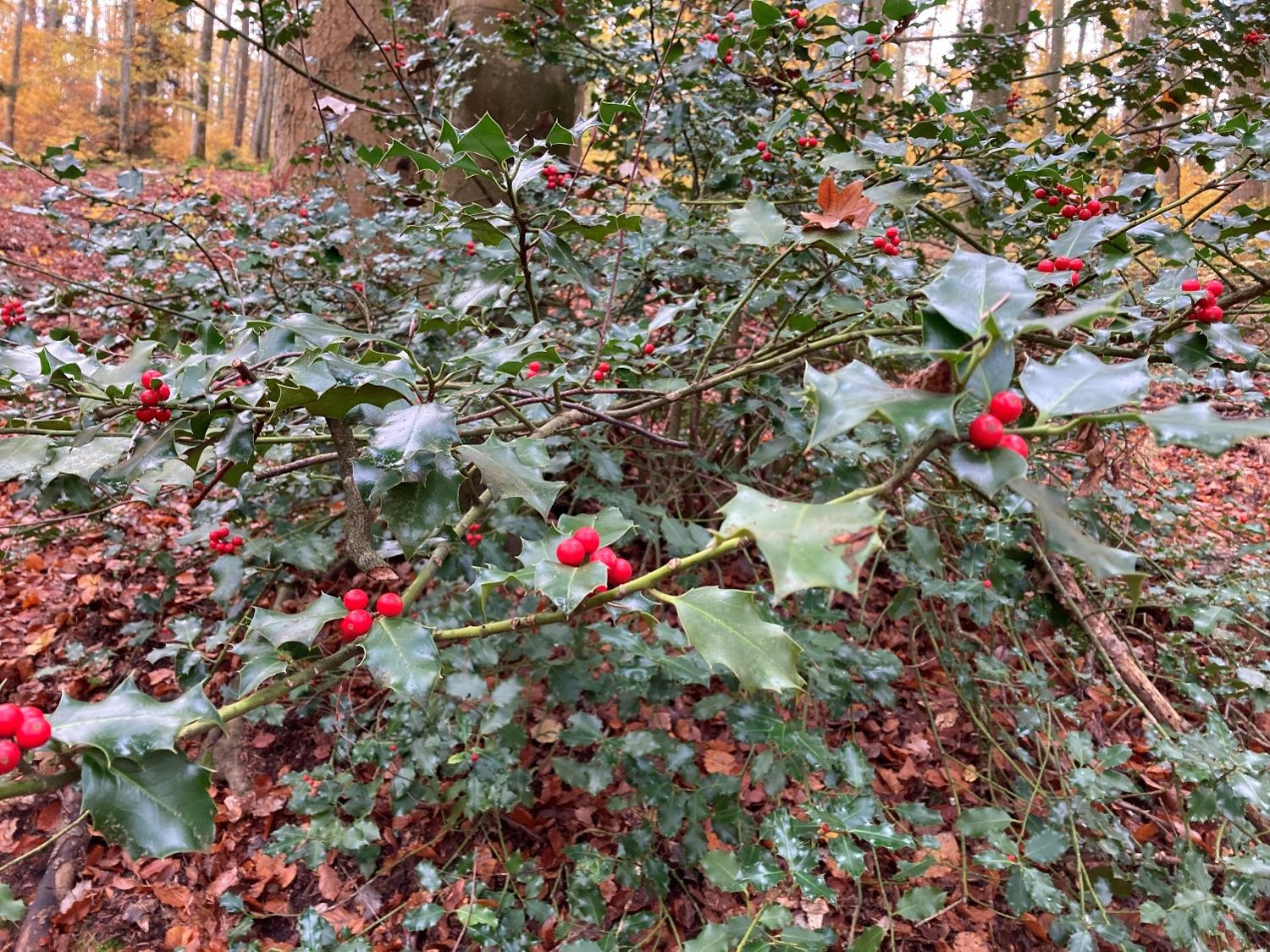 European holly (Ilex aquifolium) have evergreen leaves. The female bushes produce red berries in the autumn. Vosges Mountains, France.