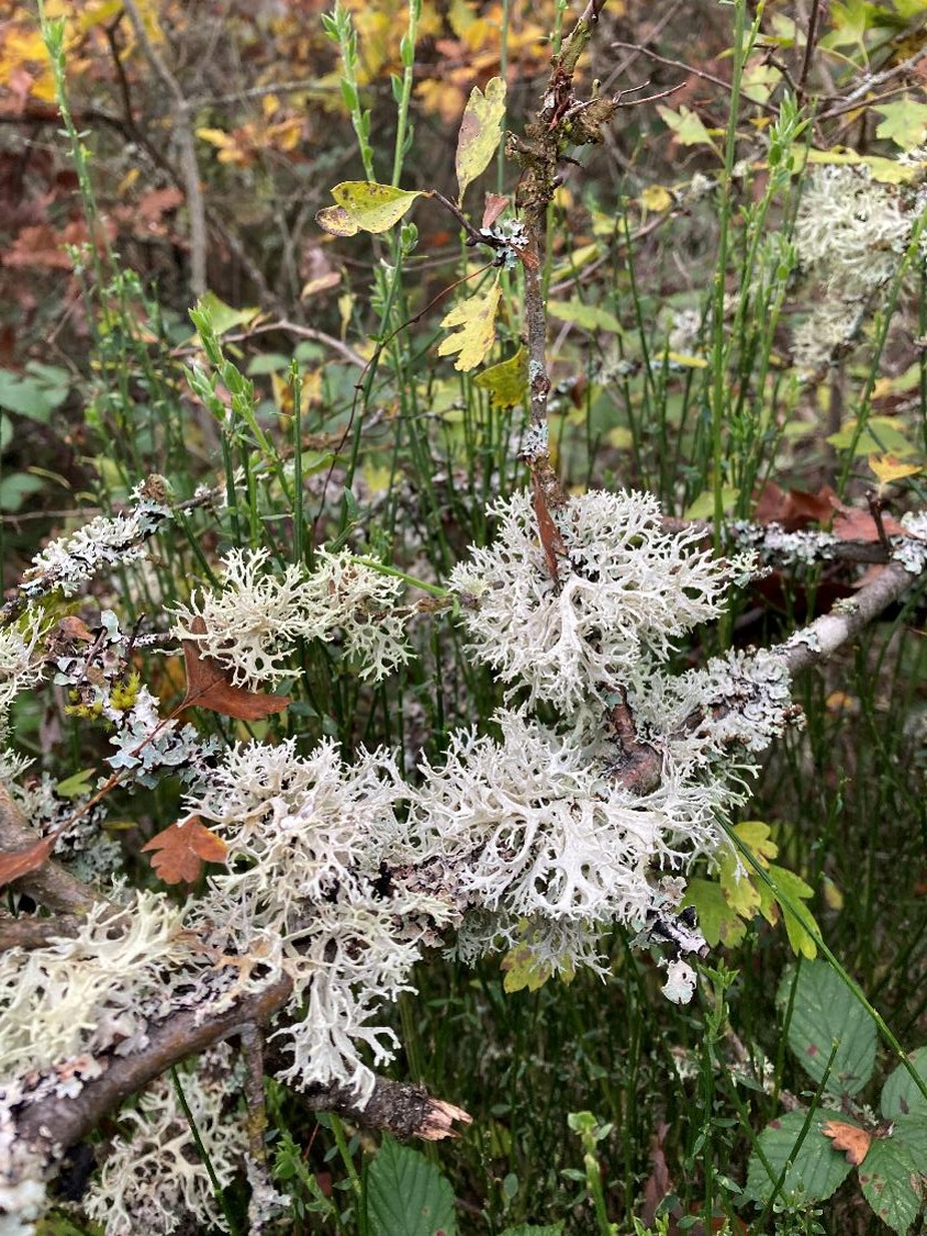 Evernia lichens in the forest above St. Hippolyte in the Vosges mountains of Alsace, France. Lichens are fungi with photosynthetic algae inside of them, thus they do not depend on other organisms for food.