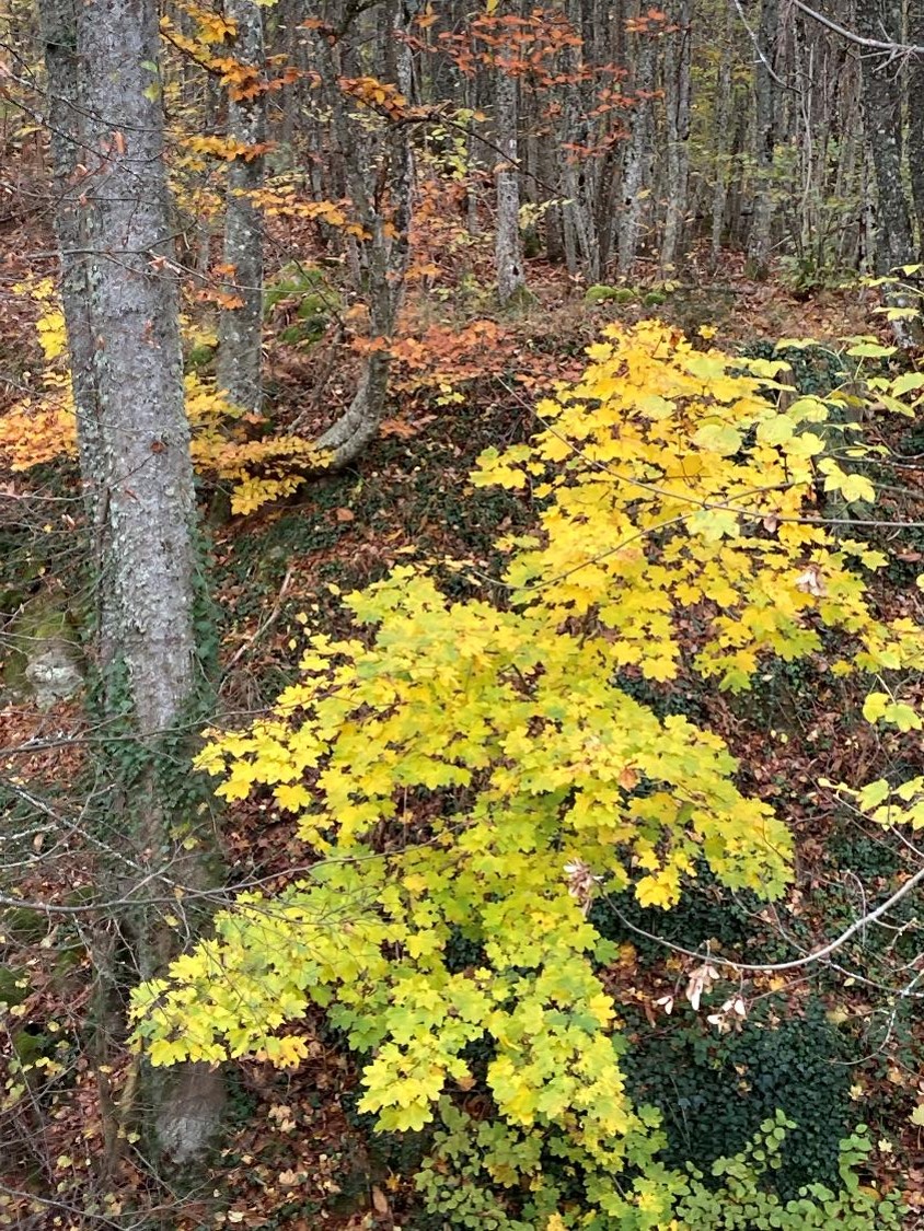 Maple (Acer pseudoplatanum) leaves turn bright gold in the autumn in the Vosges Mountains of France.