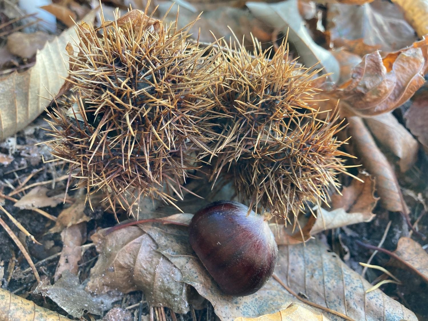 Chestnuts (Castanea sativa) drop their spiny involucres and nuts onto the forest floor in the Vosges Mountains of France, where many people gather them.