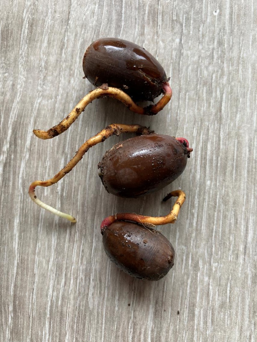 Acorns of Quercus petraea from the Vosges Mountains germinate in the autumn. Squirrels will not eat acorns that have already germinated and started to use up their food supply. This is an evolutionary strategy for escaping from herbivorous “seed predators.” The little seedling overwinters, then the stem and leaves emerge in the spring.